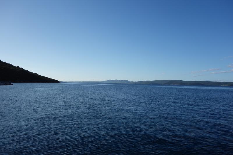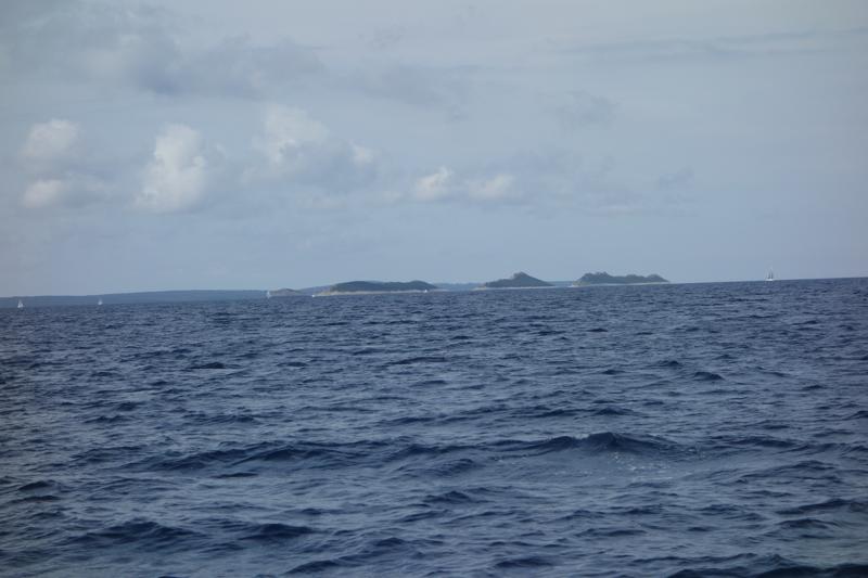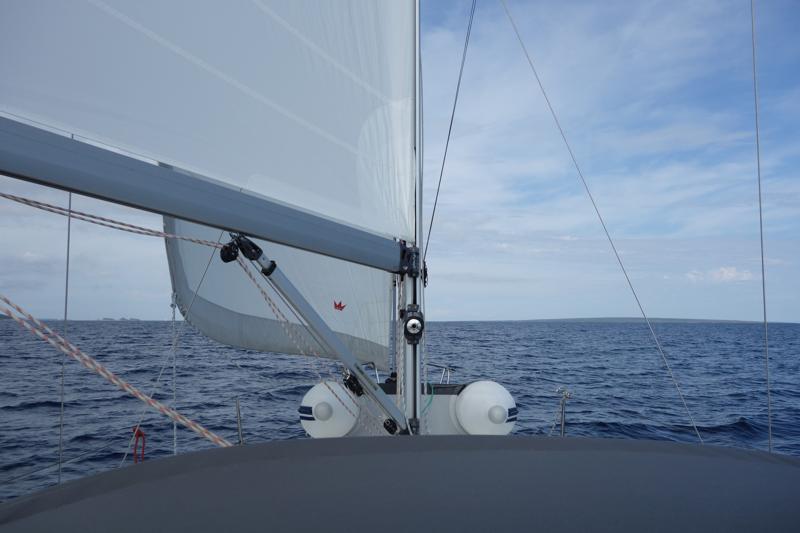 Nachdem wir eine ruhige Nacht verbracht hatten, hieß es um 08:15 aufstehen und Frühstück zubereiten. Um 10:00 Uhr lichteten wir den Anker und setzten bei leichtem Wind unter Segel unsere Fahrt zunächst nach Nordwesten fort, bevor wir nach Westen abbogen. Zwische zwei Inseln nahm der Wind deutlich auf bis zu 5 bft zu, ich dachte zunächst an einen Düseneffekt, aber der starke Wind hielt auch auf dem nun offenen Meer an und berscherte uns Wellen von 1 - 1,5 m Höhe.