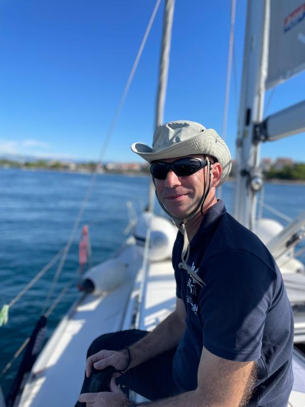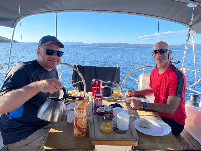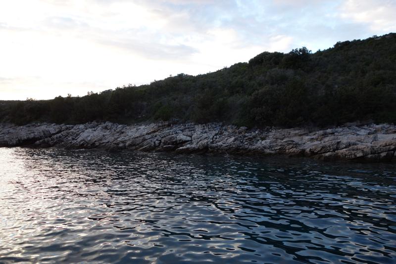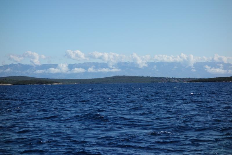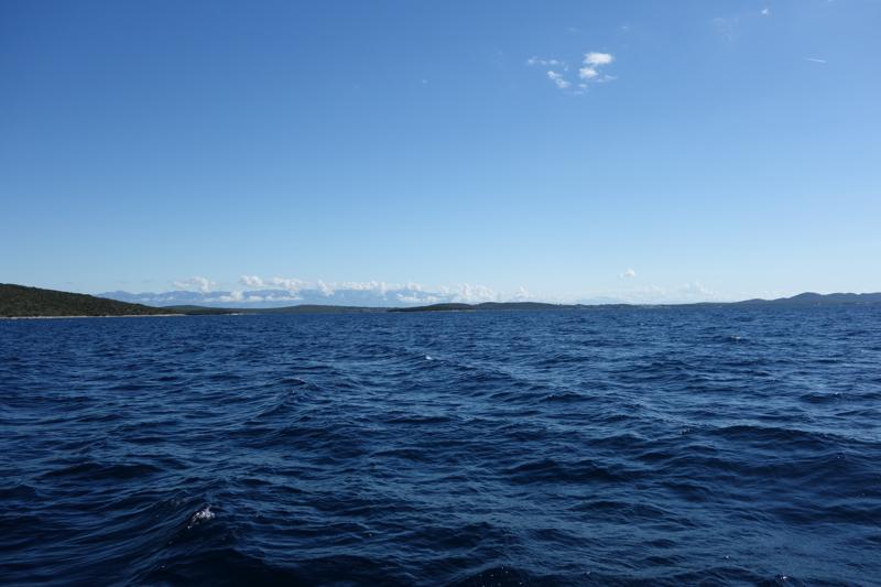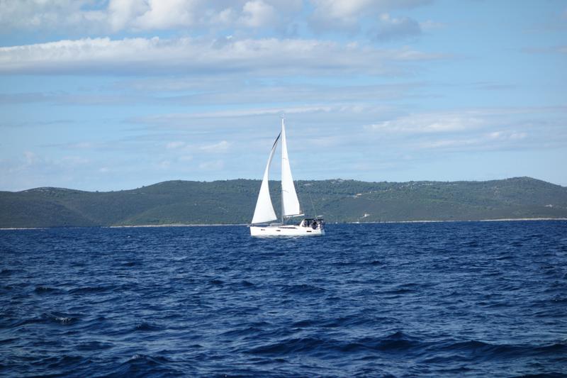 Nach dem Aufstehen um 08:00 und dem Frühstück weisen wir André in das Boot ein, bevor wir um 10:30 die Festmacher loswerfen und bei schwachem Wind unter Segel nach Nordwesten fahren. Um 14:00 Uhr ist unser anvisiertes Ziel noch recht weit entfernt, so dass wir den Motor starten und nun zügig einen Ankerplatz vor Molat anlaufen. Das Ankermanöver klappt problemlos, nach dem obligatorischen Ankerbier nehmen wir erst einmal ein Bad in der Bucht, bevor das Abendessen (Cevapcici mit Ajvar und Reis) gekocht und serviert wird. Die Wassertemperatur ist mit 25 °C sehr angenehm.